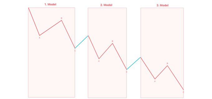 Bu kavram piyasanın düşüş yönlü model sonrası gelen kısa bir toparlanma sonrasında yeni bir düşüş yönlü modelin gelmesi ve bunun tekrarlanması durumu için kullanılır. Tekrarlanma, maks 3, min 2 model içeren kompleks yapılarda görülürler. (Kırmızılar her bir modeli ifade eder.)