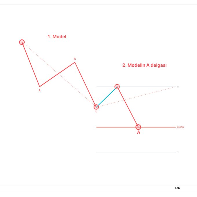 1. modelin tamamının başlangıç ve bitiş noktasını fiyat olarak alırsın ve dersin ki 2. modelin A dalgası bu uzunluğun 0,618’i kadar olur. (Dikkat ediniz 2.modelin tamamı değil 2. modelin içindeki A dalgası) (fib ext. ile ölçülür) Yani ilgili görsel şöyle olacaktır: