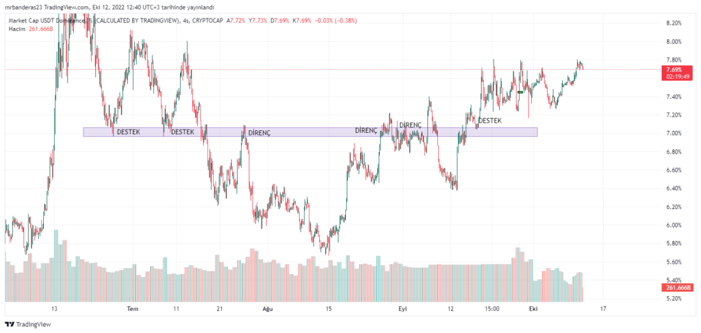 USDT.D grafiğini incelediğimizde mor kutunun önce destek olarak çalıştığı, daha sonra bu desteğin kırılarak direnç olarak çalıştığını gözlemleyebiliriz.