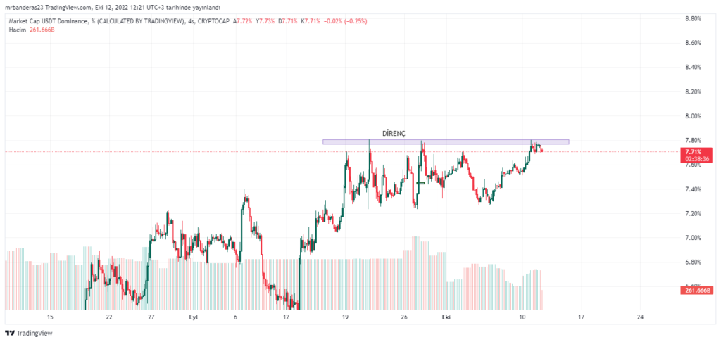 USDT.D grafiğini incelediğimizde 7,80 seviyesinin kuvvetli direnç olduğunu görebiliriz. fiyat bu seviyeye her gelişinde dirençten tepki alıp geri dönmüştür.