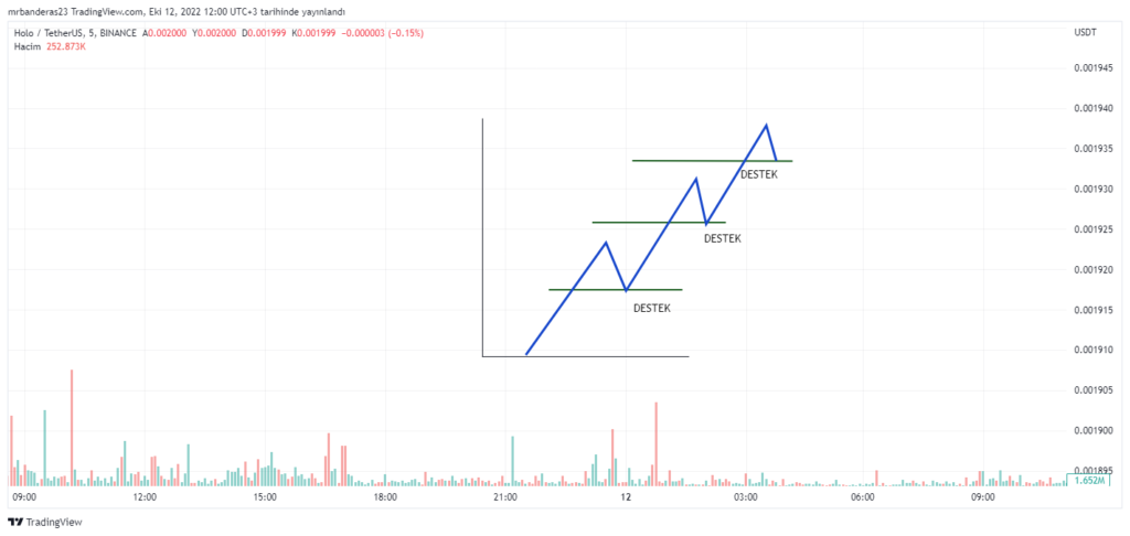 Grafikte yeşil çizgi ile belirlenmiş alanlar destek seviyeleridir. Fiyat her yükselişinden sonra düzeltme yapmak için destek seviyelerine geri çekilmiştir. Bizim işleme dahil olmamız gereken alanlar destek veya direnç seviyeleridir. Bu alanlardan teyitsiz işleme girilmez. Fiyat desteğe gelip burdan daha aşağıya düşebilir. Her destek seyiyesi fiyatı tutar diye bir kesinlik söz konusu değildir.