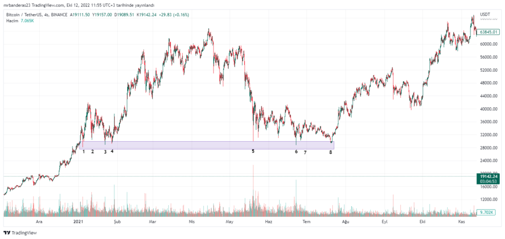 Bir destek ne kadar fazla test edilirse okadar güçlüdür diyebiliriz. Bitcoin grafiğini incelediğimizde Ocak- Temmuz 2021 arasında ki süreçte 29000$ desteğinin 8 kere çalıştığını gözlemliyoruz. Bu durumda desteğimizin güçlü olduğunu bir daha bu alana geldiğinde tepki almasını bekleriz.
